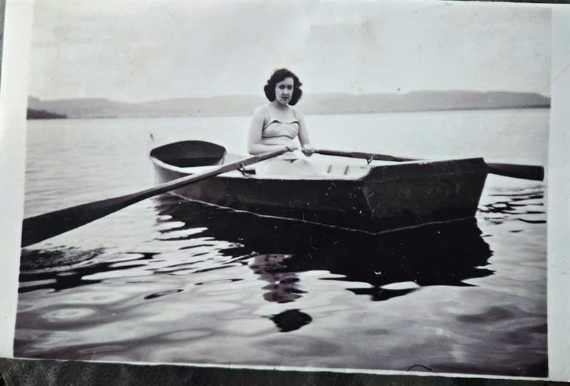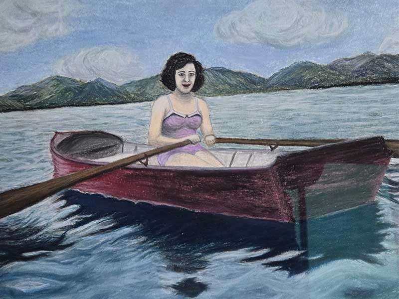 After my mother passed away in the summer of 2023, my sister in Montreal sent me a variety of photos from my mother’s life.  Among them was this one: a black and white image of my mother, in her early 20’s, sitting in a rowboat on a lake.  After considering the colors I was to employ, I enjoyed completing this rendition, inspired by the photograph, both of which are included on this page.